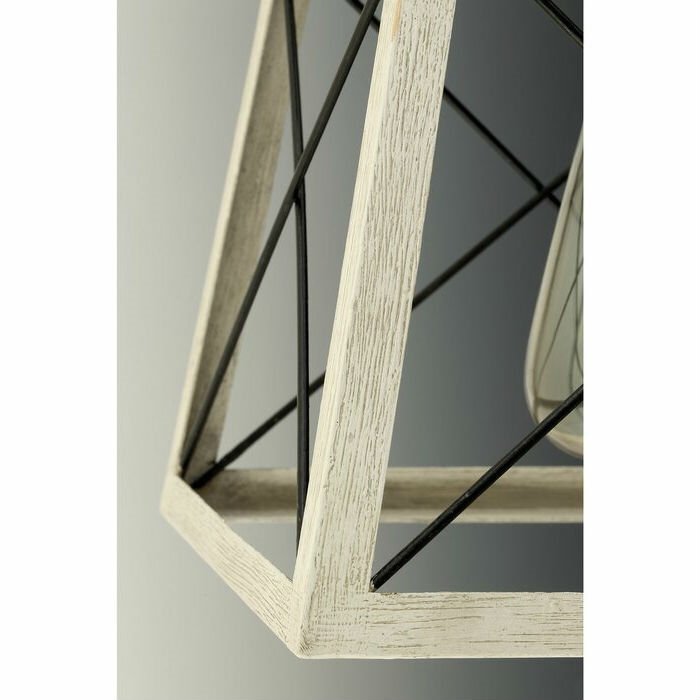 This Graphite Dimmable Light Lantern Geometric Chandelier crisscross metal supports lend a nod to barn door designs, while a painted faux wood finish enhances the open steel frame’s rustic character. This pendant accommodates dimmable 100 W maximum light (bulb NOT included). Compatible with standard and sloped ceilings.